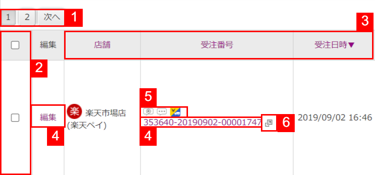 | 4編集 | 「編集」または「受注番号」をクリックすると各受注の詳細情報の確認・編集ができる画面に遷移します。 |