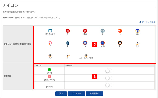 - 1「アイコン」をプルダウンから選択し「一括編集画面へ」ボタンをクリックします。