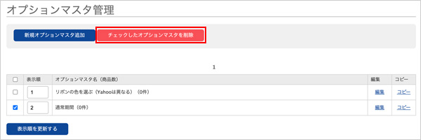 商品の紐付け解除後に操作して下さい。 - 「チェックしたオプションマスタを削除」をクリックします。