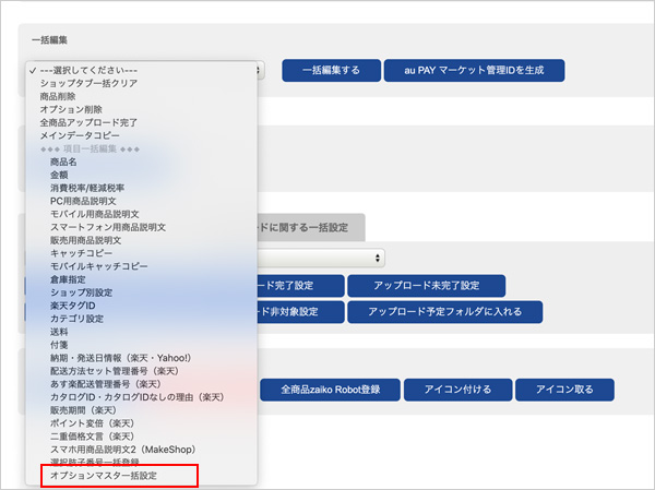 - 紐付け対象の商品を選択後、一括編集の一番下「オプションマスタ一括設定」をご利用下さい。