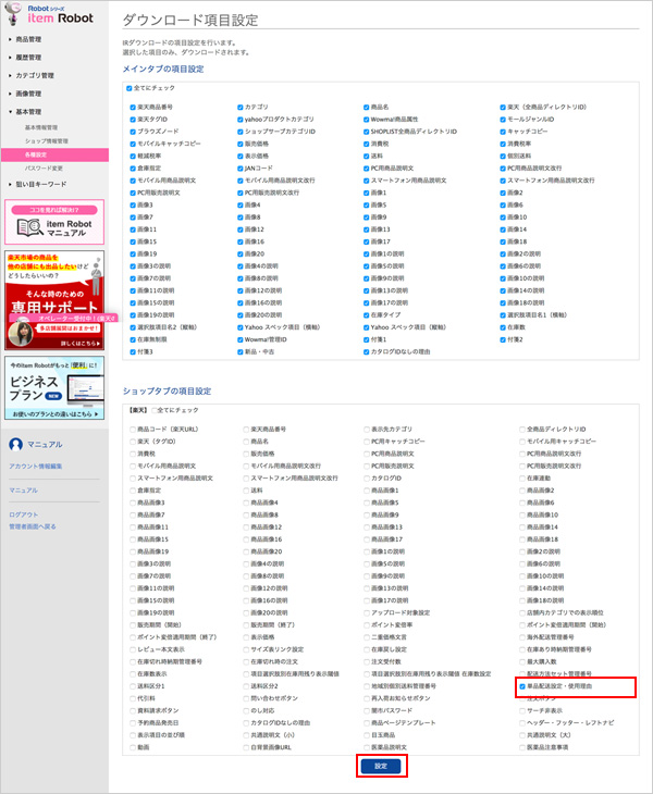 • ダウンロードを行う項目、ショップ別データの項目設定【楽天】内の「単品配送設定・使用理由」のみチェックを入れてください。