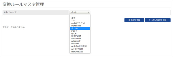商品管理>マスタ管理>変換ルールマスタ管理>新規設定登録 から行うことができます。