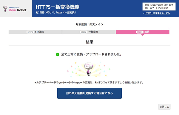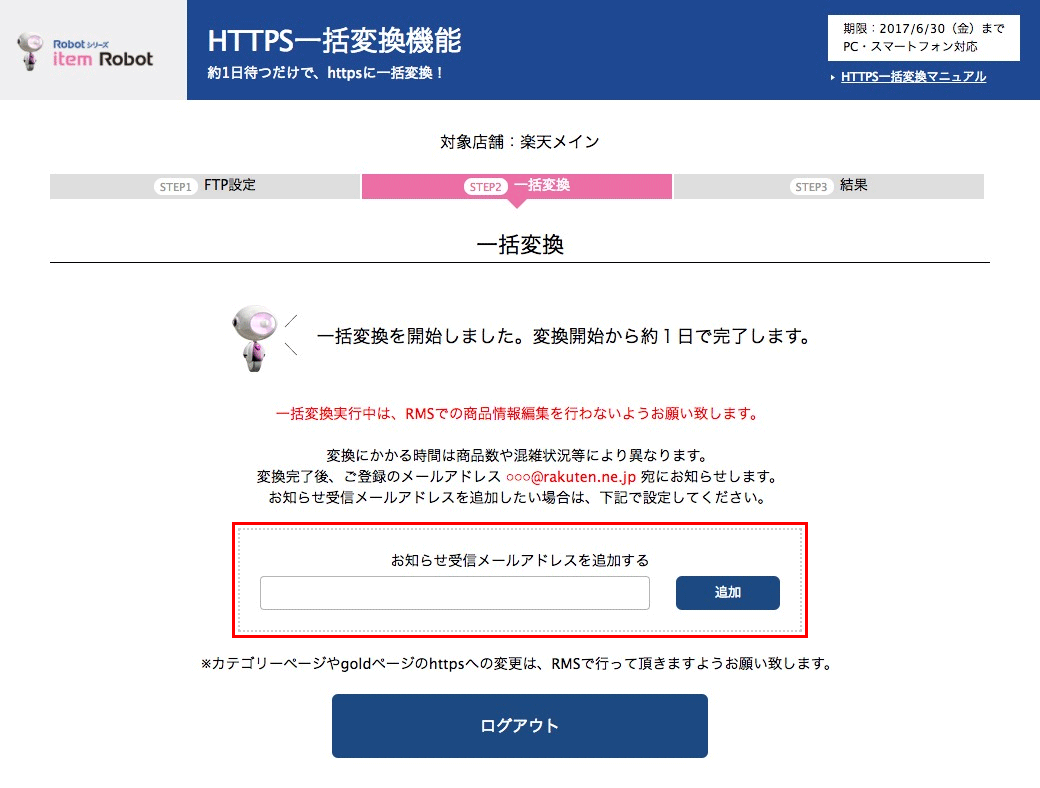 件名:【item Robot】HTTPS一括変換 完了通知 - お知らせ受信メールアドレスを追加する場合は、この画面で追加して下さい。