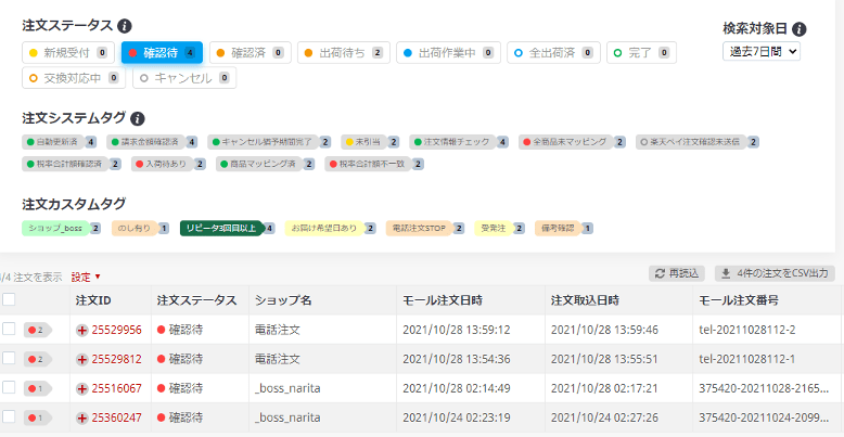 カスタムタグの条件に該当した受注には、「注文カスタムタグ」が付与され、